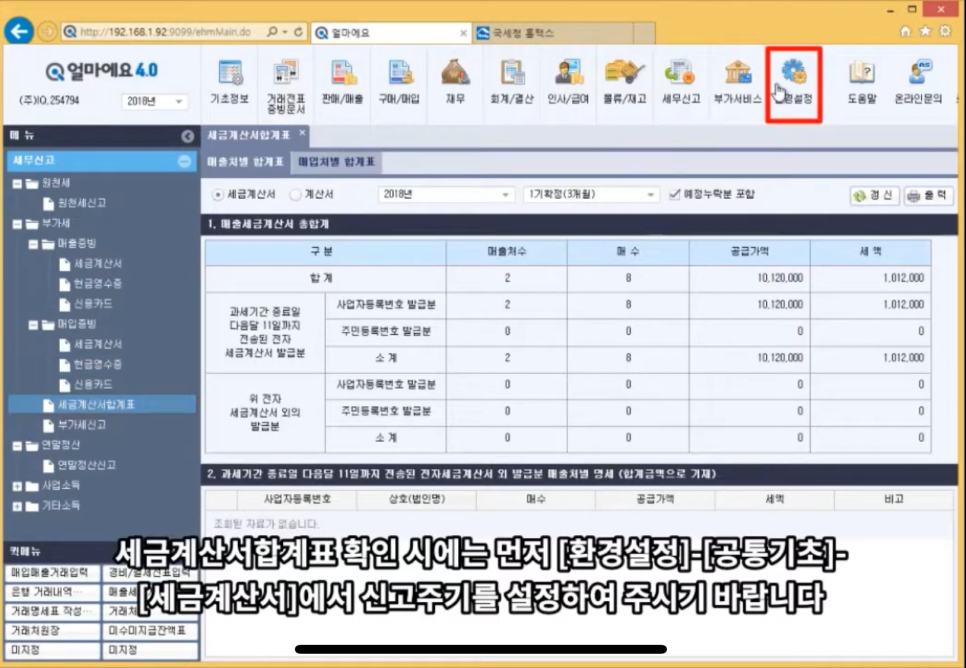 얼마에요 4.0 > 환경설정 > 공동기초 > 세금계산서에서 신고주기 설정 후, 세금계산서 합계표 확인