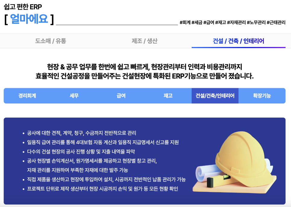 아이퀘스트 [얼마에요ERP]는 건설업 특화 ERP 솔루션으로, 외국인 일용직 근로자들의 근로계약과 근태 및 급여 관리, 4대보험 신고 등의 건설 공무 업무들을 [얼마에요ERP] 하나로 모두 처리할 수 있어요.