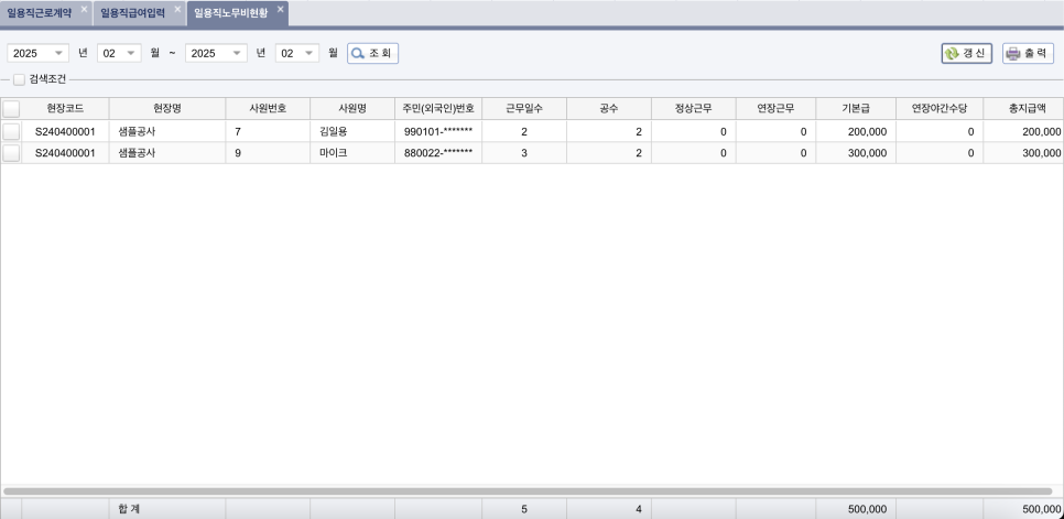 그래서 일용직 근로자를 많이 고용하는 건설사에서는 근태 기록과 급여 지급 대장 관리가 필수적입니다.