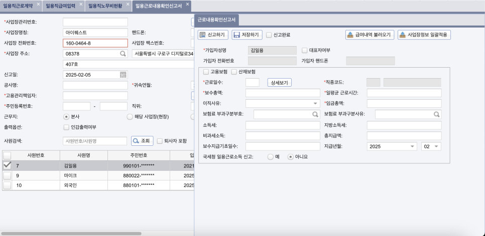 일용직 근로자를 많이 고용하는 건설업 특성에 맞춰 일용직 노무관리 시스템 하나로 근로자 등록부터 급여 지급, 일용근로내용확인신고서 제출까지 모든 관련 업무를 처리할 수 있게 세팅되어 있어요.